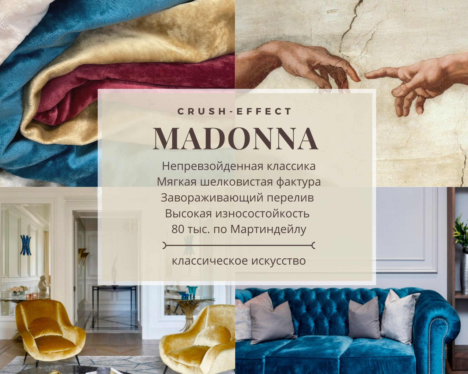 Знакомьтесь, коллекция велюров Madonna. Перед вами материал, который, кажется, только что сошёл с одной из картин эпохи Возрождения - насыщенный глубокими красками и едва заметным свечением.