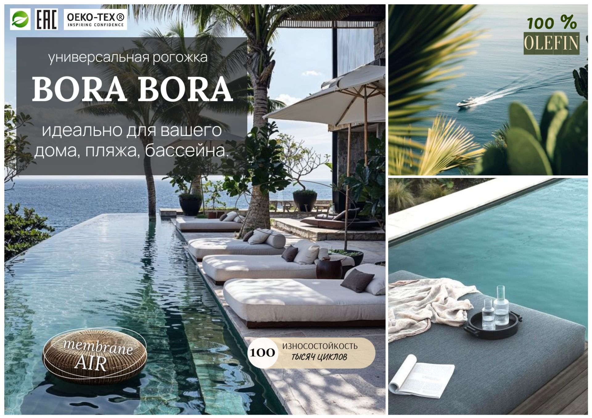 В составе этого материала 100% Олефин, а значит изделия из него будут устойчивы к солнечным лучам, соленой воде и воде из бассейна, а также к разрушительным воздействиям ветра, кристаллов соли, песка. Bora Bora – не задерживает влагу, что в значительной мере тормозит образование плесени и других микроорганизмов в волокнах ткани. Дополнительно материал оснащен водостойкой подложкой membrane air, которая пропускает воздух, но не пропускает влагу внутрь изделия.